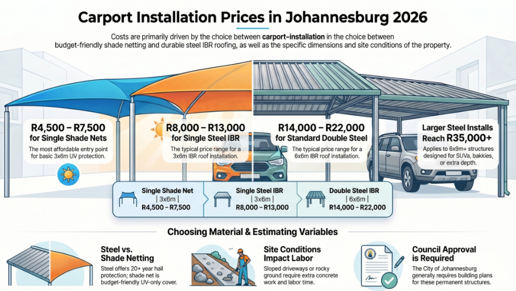 Carport installation prices in Johannesburg in 2026 range from around R4,500 for a basic single shade net carport to over R35,000 for a large double steel carport with IBR roofing. Most Johannesburg homeowners installing a standard double steel carport are looking at somewhere between R14,000 and R22,000 installed. The final price depends on size, roofing material, steel gauge, and site conditions.
